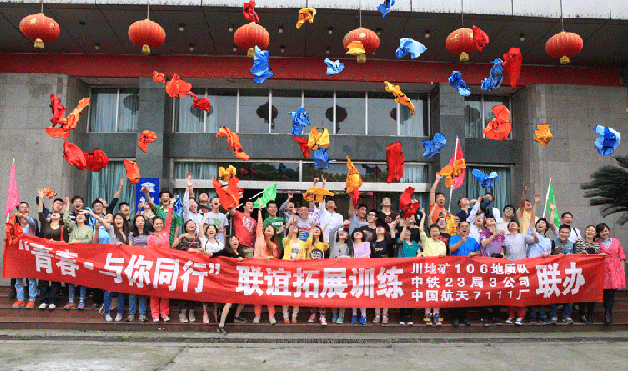 4月19日周六,106队在成都近郊的东方幸运城,与中铁二十三局三公司、7111厂共60余名青年职工开展了“青春作伴  与你同行”联谊拓展训练活动。