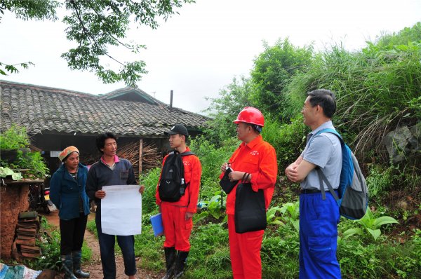 就在郑淞桂和他的组员们被感动的情难自抑之时,李桂福、孔德才所在的另一个排查组却陷入了甜蜜的苦恼中。此次地灾专项排查从省、市、县到乡镇,各级政府高度重视,当地群众期望值极高,他们视106队的地质队员们为亲人,统称他们为“省上的专家”,不管有没有地灾险情,每一户老乡都想拉着他们到自己家里看看,他们认为:只有“省上的专家”确认没问题后,他们才能在下雨天睡上一个安稳觉。当地群众的热情与信任给排查工作造成了极大的困扰,此次排查时间紧任务重,工作的高强度是地质队员们从未经历过的,他们已经没日没夜“连轴转”了十余天了,大量的“假地灾点”却耗费他们大量的宝贵时间。今天他们在盐边县的渔门镇排查,从上午8点到现在,他们分别跑了5个点,其中只有一个是真正的地灾点。下午一点半,匆匆结束简单的午餐,他们在村社干部的陪同下开始紧张的工作。这是一个刚上报的地灾点,一户居民的房屋和地面出现了不同程度的裂缝,房屋主人认为是山体滑坡造成的,强烈要求“省上的专家”进行排查。地质队员们到达现场时,房屋主人不在,大门紧锁。围着房前屋后,排查工作严谨的展开,最后得出结论:裂缝是由建房时屋后边坡挖得过陡,地基填充不实以及房屋年久失修造成的,不在地灾隐患范围之内。下完结论,他们匆匆赶往下一个工作点。还没过两小时,镇政府值班电话打过来了:之前那户户主,认为“省上的专家”没进他的家门就下了排查结论,请求再次排查。李桂福们苦笑,这类情况他们在之前十余天的排查中遇到得太多太多,由于当地老乡地灾防治常识的严重匮乏,导致了这样频繁上报却非地灾隐患的情况时常发生。地质队员们深深的理解老乡们因“6.24”茂县地灾造成的恐惧和心理阴影,他们对非地灾点的当地群众只能做耐心细致的解释工作,普及地灾防治知识的同时,缓解老乡们的紧张情绪,消除他们的恐惧心理。虽然也有被误解的委屈,但他们更习惯带着地质队员的高度责任感去面对老乡们那一双双渴盼、信任的眼睛。所以,当他们步行30公里,结束当天的排查工作后,又专程赶回那户人家,继续着他们的地灾科普……