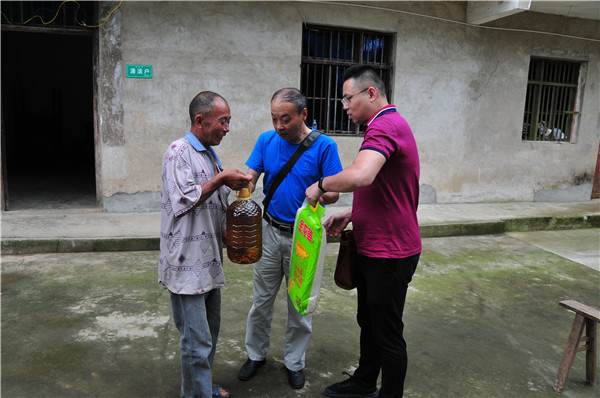 慰问组一行先后到自己个人帮扶的9户帮扶对象家中走访调查,了解贫困户家庭成员信息、生活生产条件、收入情况等,宣传党的好政策,为帮扶对象脱贫致富出谋划策并送上由队属基层党支部党员个人出资购买的大米、菜籽油等慰问物资。