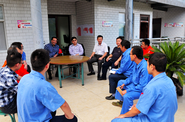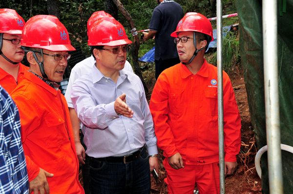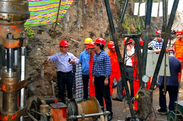 王继春一行来到中坝石墨矿项目部,认真查看工作和生活环境,听取项目汇报,了解项目概况、矿区分布、机场协调、工作流程和安全防护措施等情况,把组织的关心和慰问送到一线,把局党委的希望和祝福传递给每一位地质队员。在钻探施工现场,他一边听取队属川西南公司负责人对项目运行、勘查成果、及在钻进过程中环境保护、绿++色勘查的情况介绍,一边查看钻机施工和岩心采取情况。当看到地质技术人员和全体钻探人员乐观敬业、无私奉献的热情,他深受感动并给予了高度肯定。